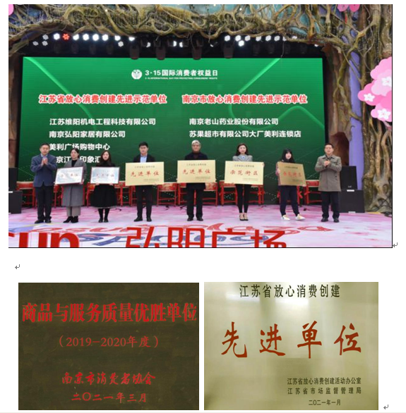 通過(guò)江蘇維陽(yáng)人不懈的努力,2020年江蘇維陽(yáng)在江北新區(qū)市場(chǎng)監(jiān)督管理局的推薦提名下,分別經(jīng)過(guò)南京市和江蘇省市場(chǎng)監(jiān)督管理局的嚴(yán)格審核,獲得了”南京市2019-2020年度商品與服務(wù)質(zhì)量?jī)?yōu)勝單位”和“2020年度江蘇省放心消費(fèi)創(chuàng)建先進(jìn)單位”的榮譽(yù)稱(chēng)號(hào)。